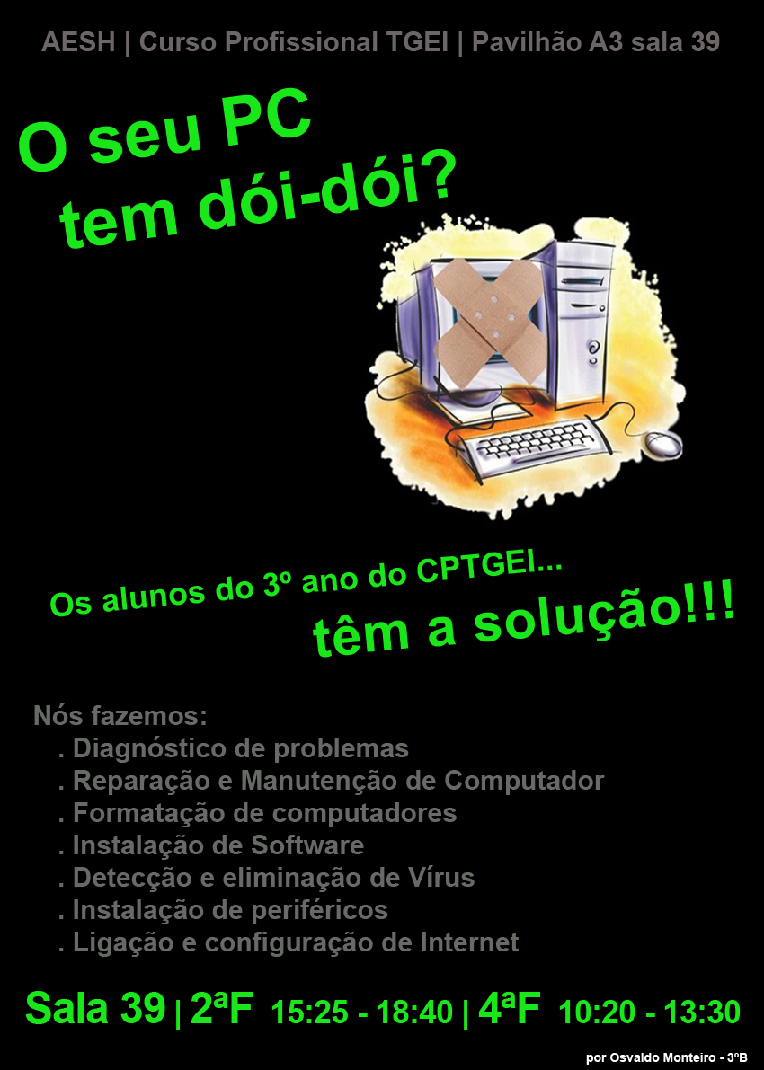 No sentido de reforçar a vertente Técnico-Profissional do Curso Profissional Técnico de Gestão de Equipamentos Informáticos, a Oficina de Informática pretende ser um espaço onde os alunos do 3ºB possam aplicar os conhecimentos adquiridos relacionados com a manutenção, reparação e instalação de equipamentos informáticos da escola e dos seus colaboradores.